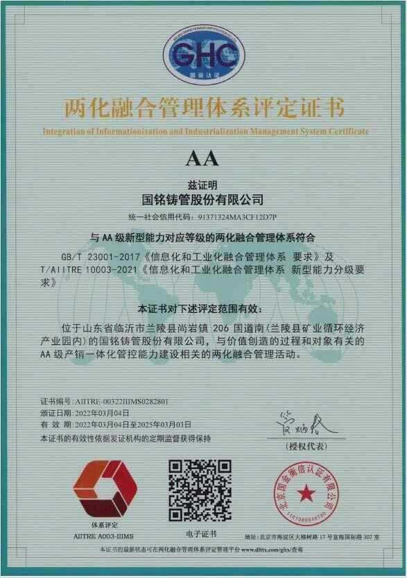 在半個多世紀的崢嶸歲月中,國銘鑄管依托雄厚實力和專業技術品質,堅持“技術提升質量,品質鑄就品牌,創新推動發展”的企業宗旨,為客戶提供滿意的產品和服務